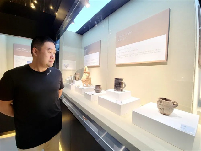 “你看,我非常喜歡這個杯子。我國在新石器時期出現(xiàn)了陶器,其中龍山文化的黑陶蛋殼杯體現(xiàn)了這一時期陶器制作的最高水平,這個黑陶蛋殼杯來自于4500年前咱們山東的龍山文化,由于器型與馬克杯極其相似,又被譽為‘中華第一馬克杯’,杯壁最薄處只有0.2-0.3毫米,重量為210克,拿在手中輕若無物。”王曉波對展廳內(nèi)的杯子如數(shù)家珍,每一個杯子背后的故事和當初獲得時的喜悅之情都讓他記憶猶新。