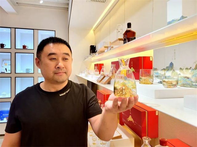 故宮是文創(chuàng)界的頂流IP,近期在故宮博物院文創(chuàng)旗艦店新上線了兩款精美杯子——“千里江山”炫彩玻璃杯和酒具套裝。杯底的金色山峰層巒疊嶂,意境悠遠。這款杯子是由王曉波帶領團隊設計制作的。