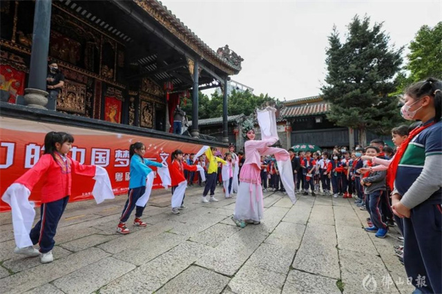 佛山市第一小學(xué)學(xué)生在萬福臺與粵劇演員互動學(xué)習。