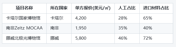 五、政策環(huán)境與隱性成本的影響 1. 行政審批效率與尋租成本 在迪拜,博物館項目可通過“黃金簽證”通道快速獲得施工許可,全程不超過30天;而巴西里約熱內(nèi)盧的歷史建筑改造審批平均耗時8個月,期間產(chǎn)生的貸款利息、場地租賃費等間接成本可達總投資的5%-7%。某些地區(qū)還存在非正式的“加急費”現(xiàn)象,進一步扭曲報價構(gòu)成。