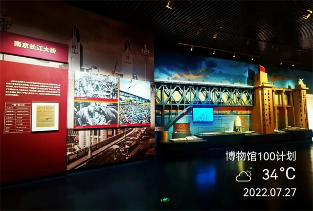 以南京人的視覺(jué),通過(guò)長(zhǎng)江掠影全景畫(huà)、大橋模型等比例縮比復(fù)原、南京長(zhǎng)江大橋?qū)n}影片、陣列排放的大橋建橋時(shí)的文物實(shí)物,立體化展現(xiàn)了社會(huì)主義建設(shè)時(shí)期的偉大成就——南京長(zhǎng)江大橋。
